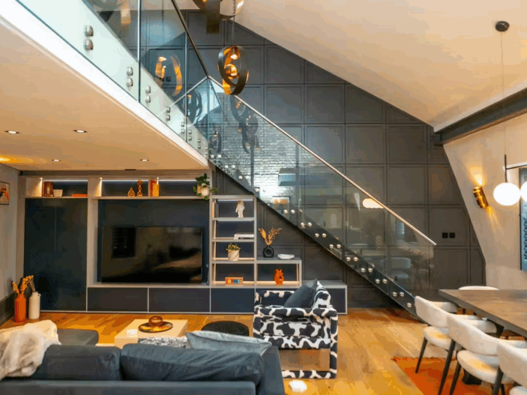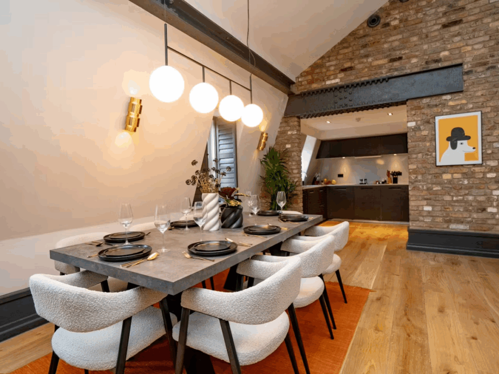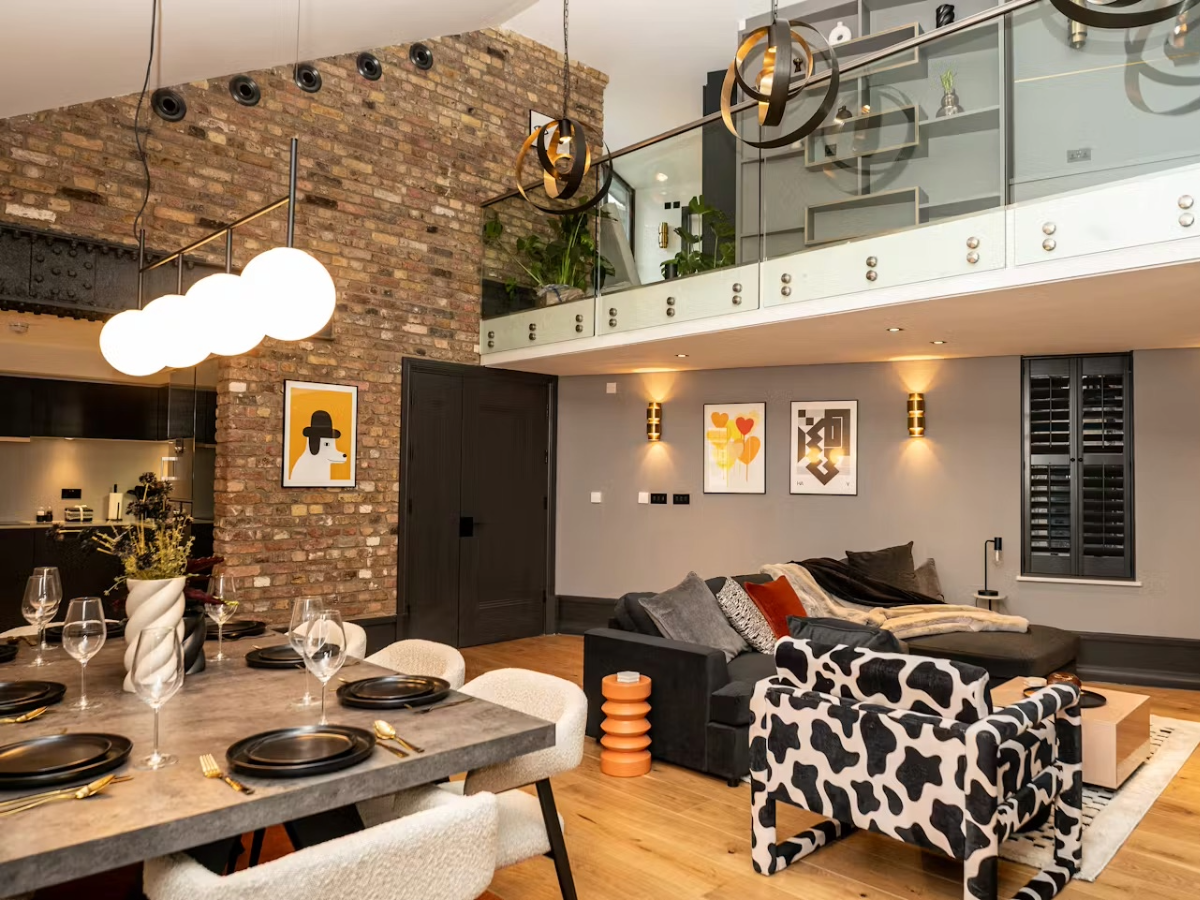 This striking London penthouse is bold, glamorous, and brilliantly located. Soaring ceilings and exposed brick walls bring drama to the open-plan living space, while the mezzanine level, glass staircase, and curated interiors add a touch of theatre.