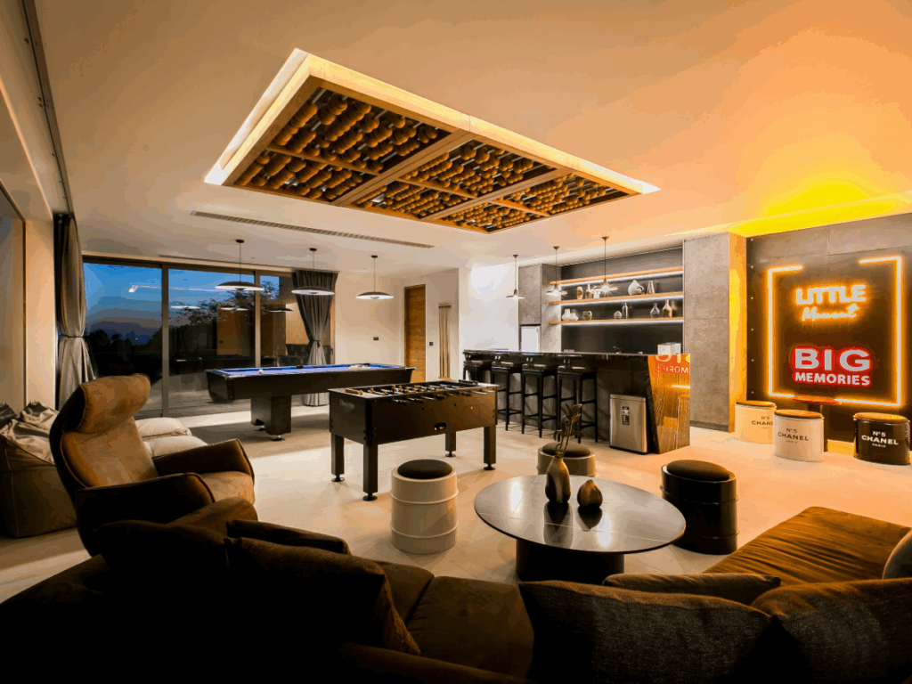 Downstairs, there is a Games room & Bar area with foosball and pool table and sofa for relaxation and drinks.